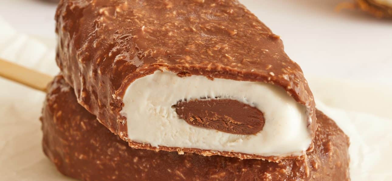 Faire fondre 150 g de chocolat au lait, puis ’ajouter 20 g d’huile de pépin de raisin et 25 g de noix de coco râpée. Quand le glaçage est à 35 degrés, plonger les bâtonnets glacés, ôter le surplus de glaçage et remettre au congélateur sur une feuille de papier cuisson.